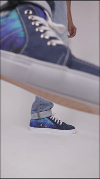 | Artist – Arshdeep Singh Art – This artwork features an array of blue hues, with fluid strokes that range from deep navy to soft sky blue, creating a serene yet dynamic composition. The varied tones and textures of the blue strokes evoke a sense of depth and calm, reminiscent of the ocean or open sky. The harmonious blend of cool colors makes it a perfect choice of adding elegance to any outfit. Perfect for those who love unique, statement-making footwear, this design exudes an air of daring creativity and unapologetic attitude. |