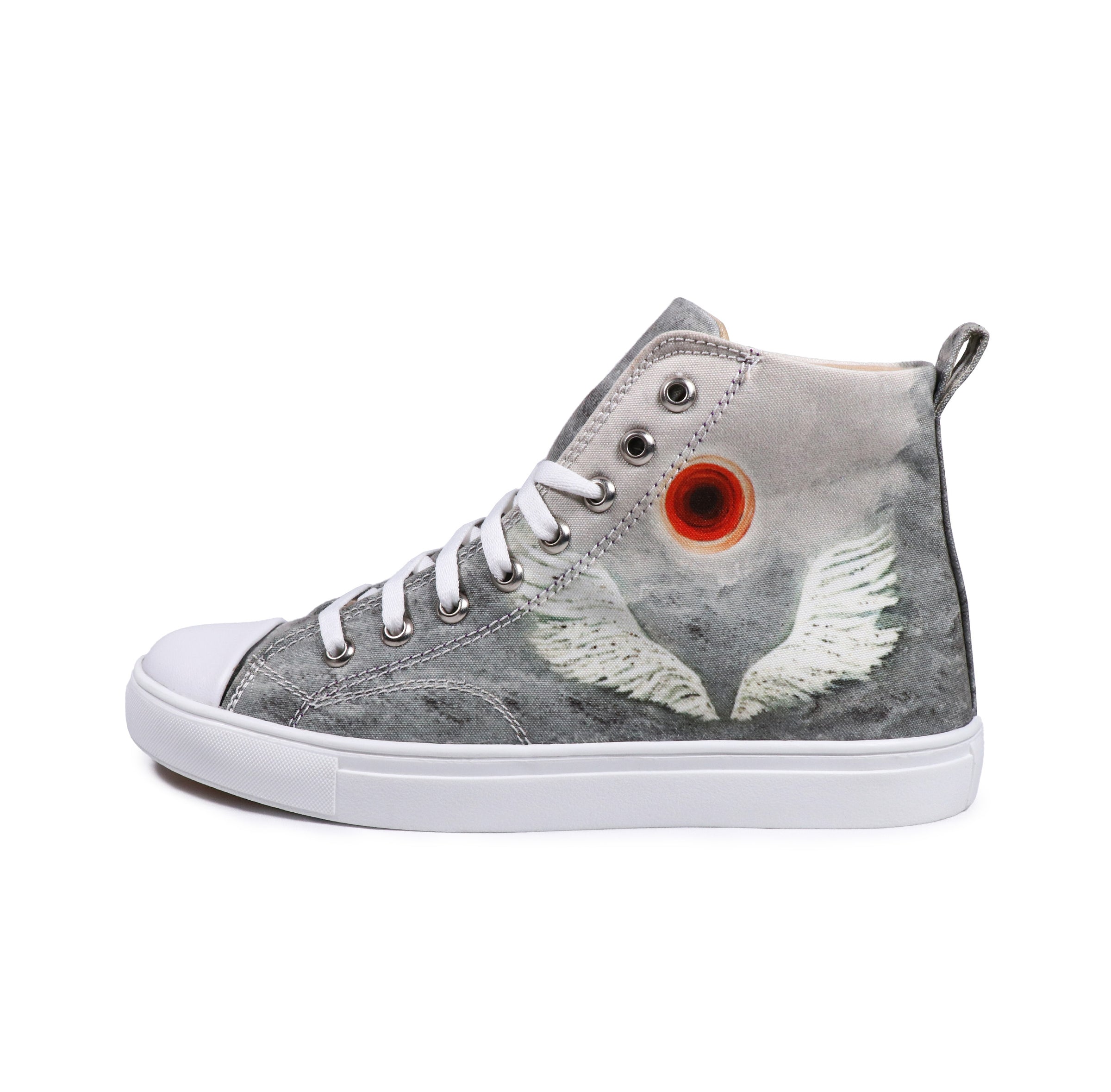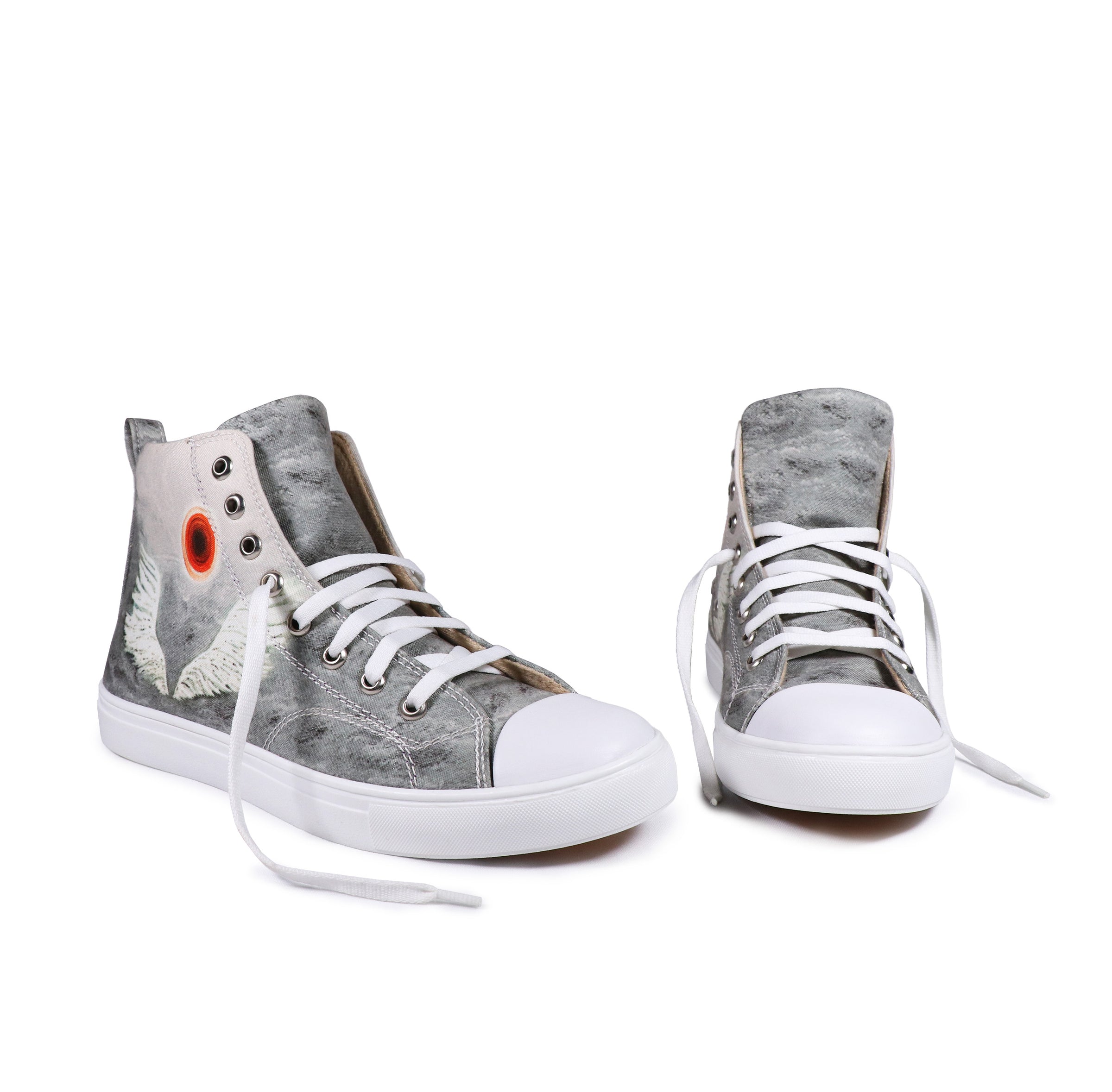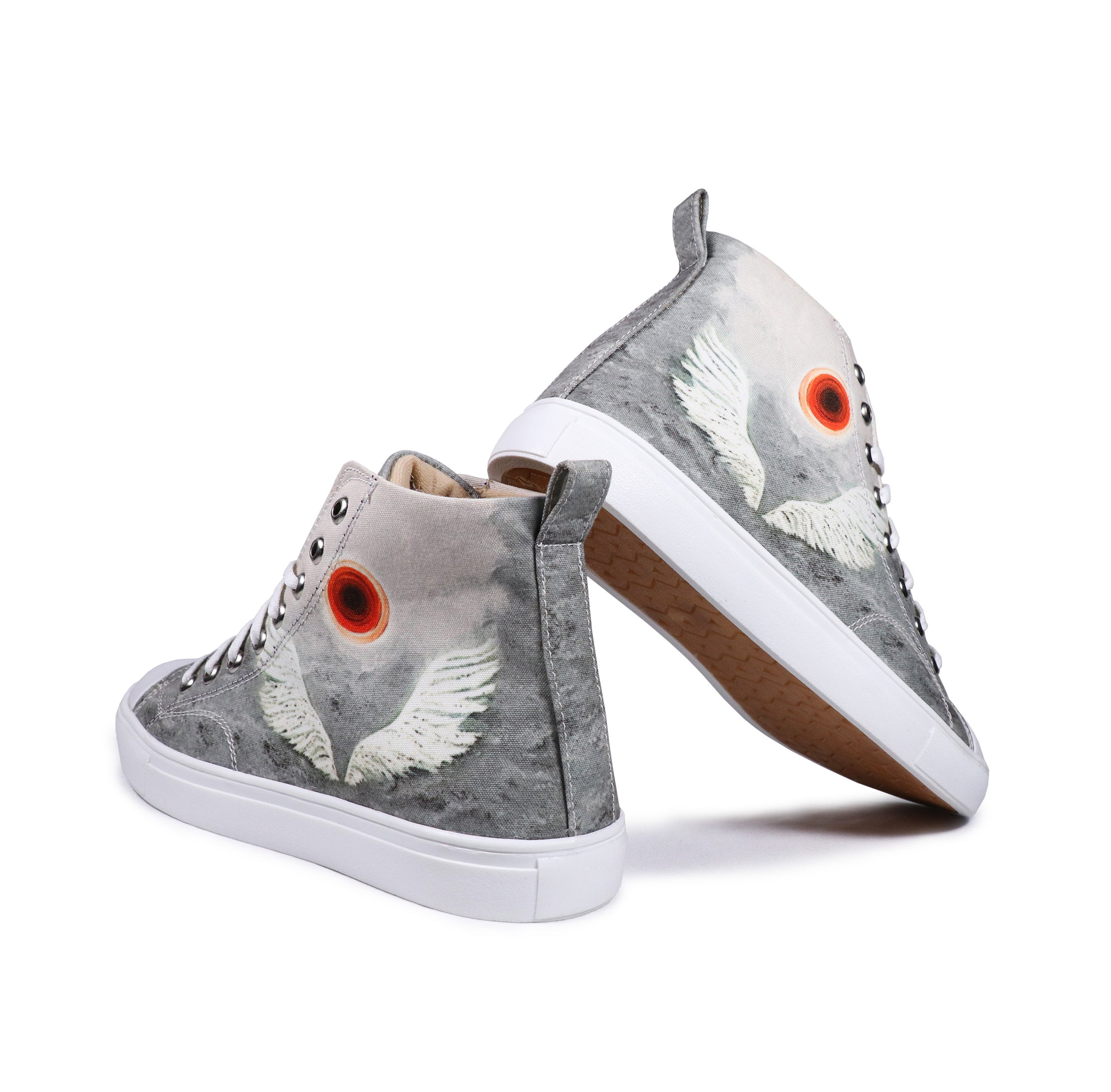| Artist – Arshdeep Singh Art This high-ankle shoes embodies the spirit of freedom with a striking winged painting and a central circle against a moody grey sky. |
