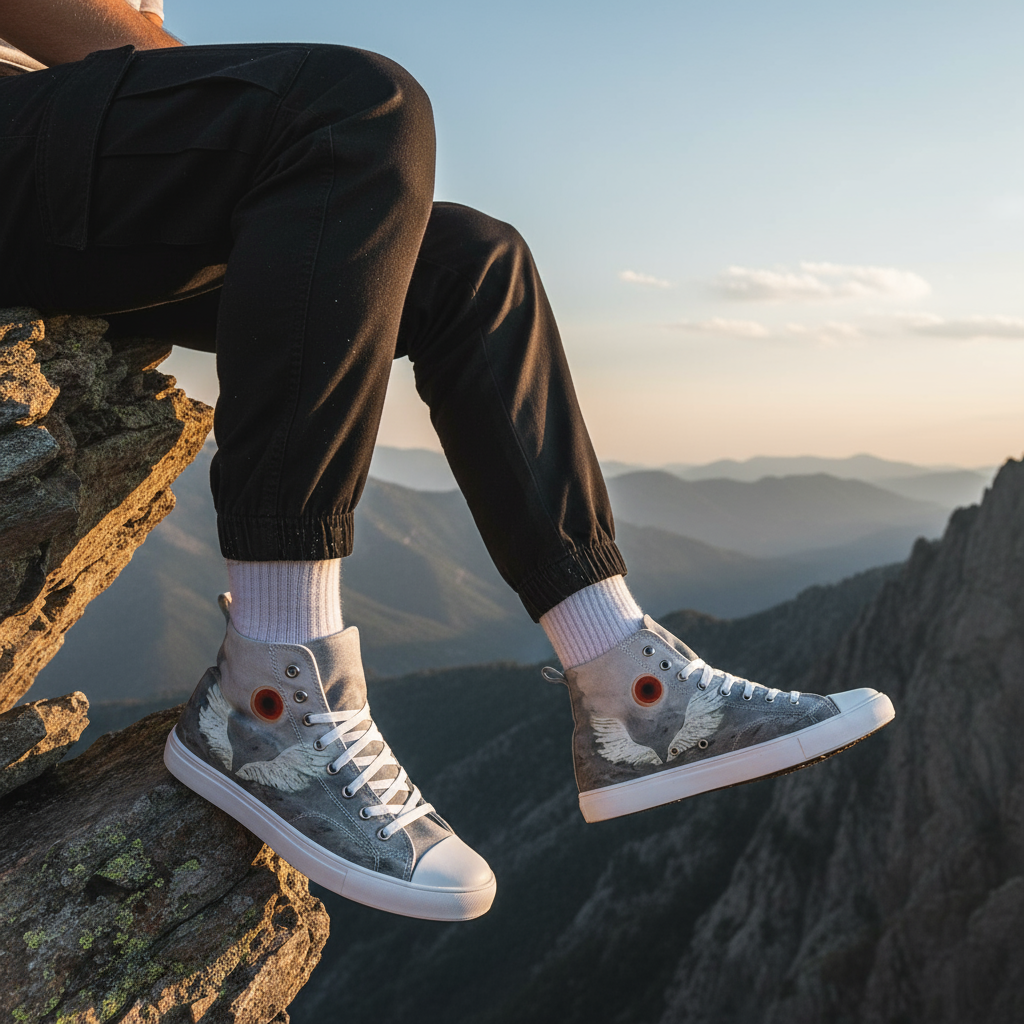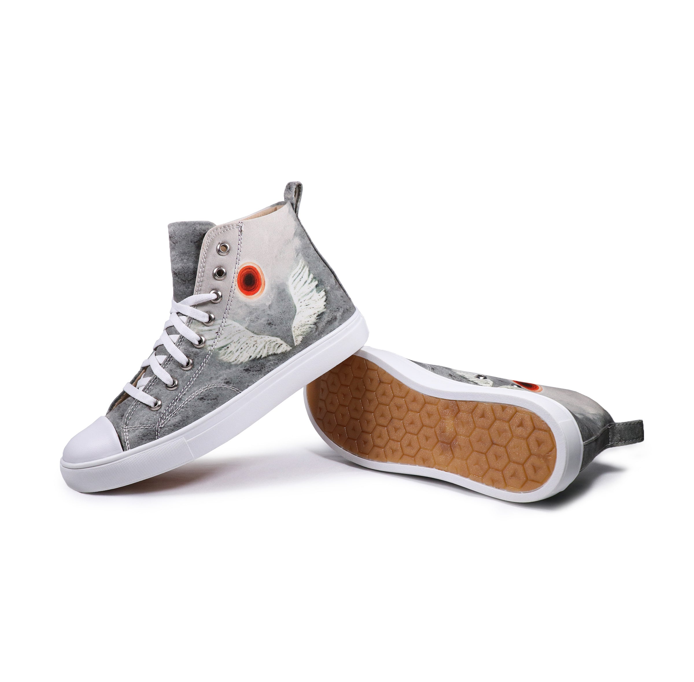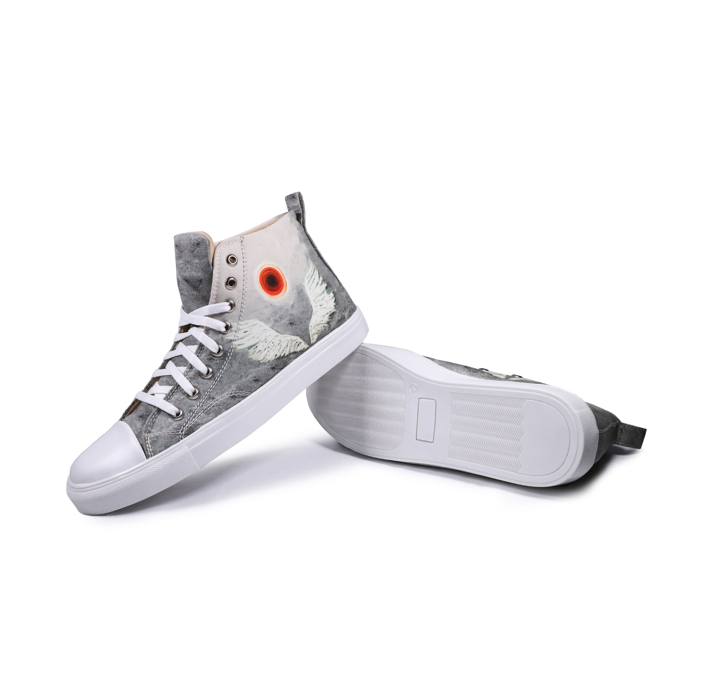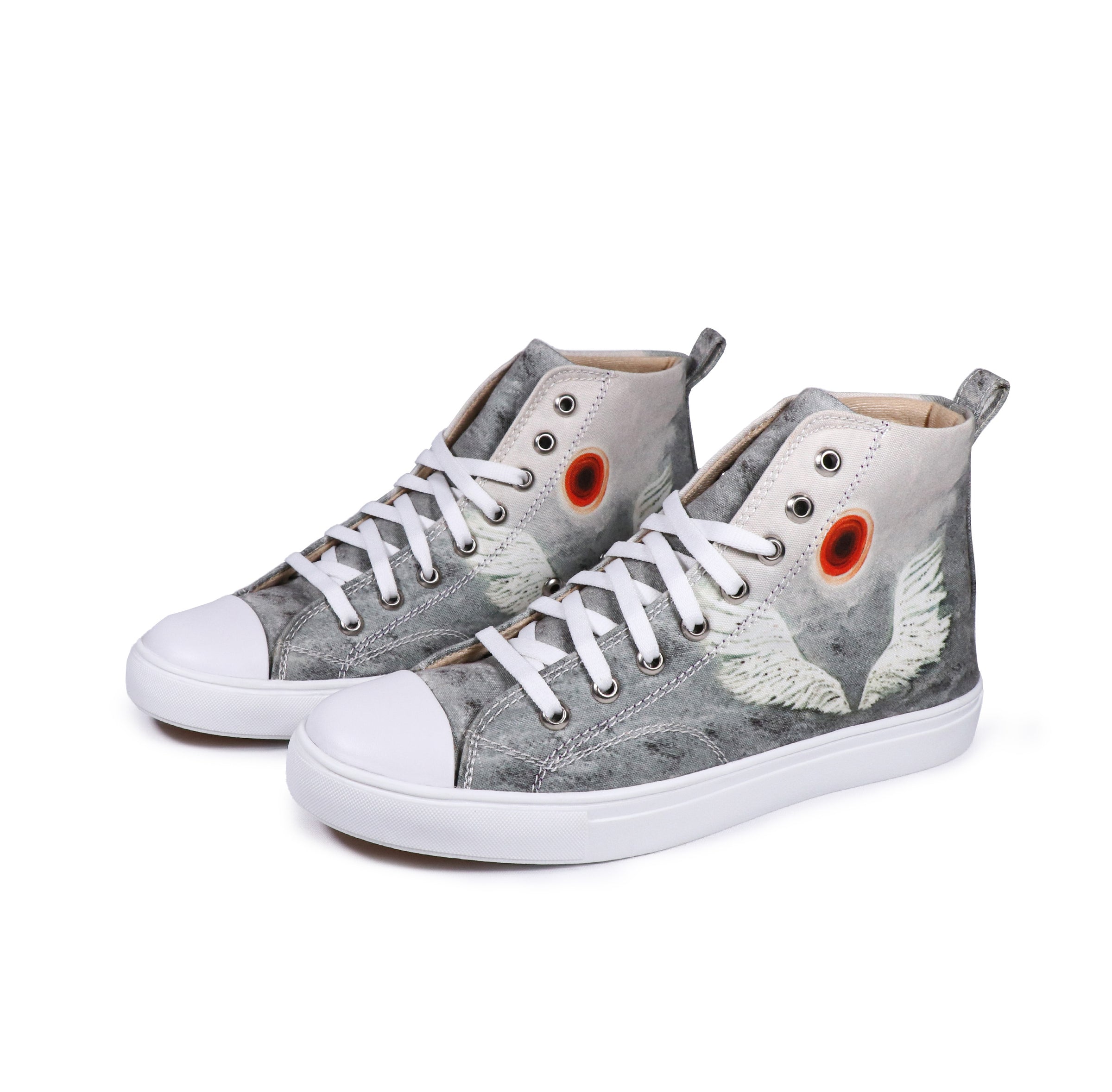 | Artist – Arshdeep Singh Art This high-ankle shoes embodies the spirit of freedom with a striking winged painting and a central circle against a moody grey sky. |