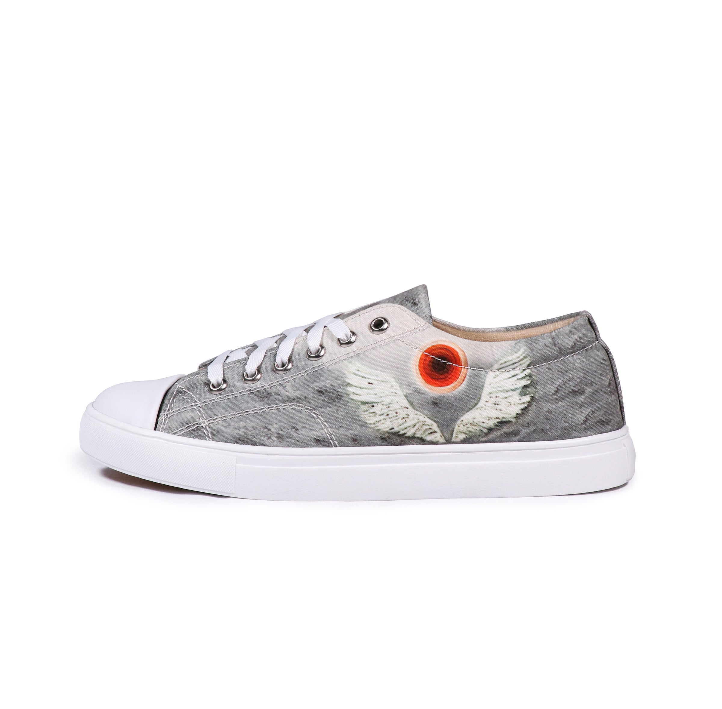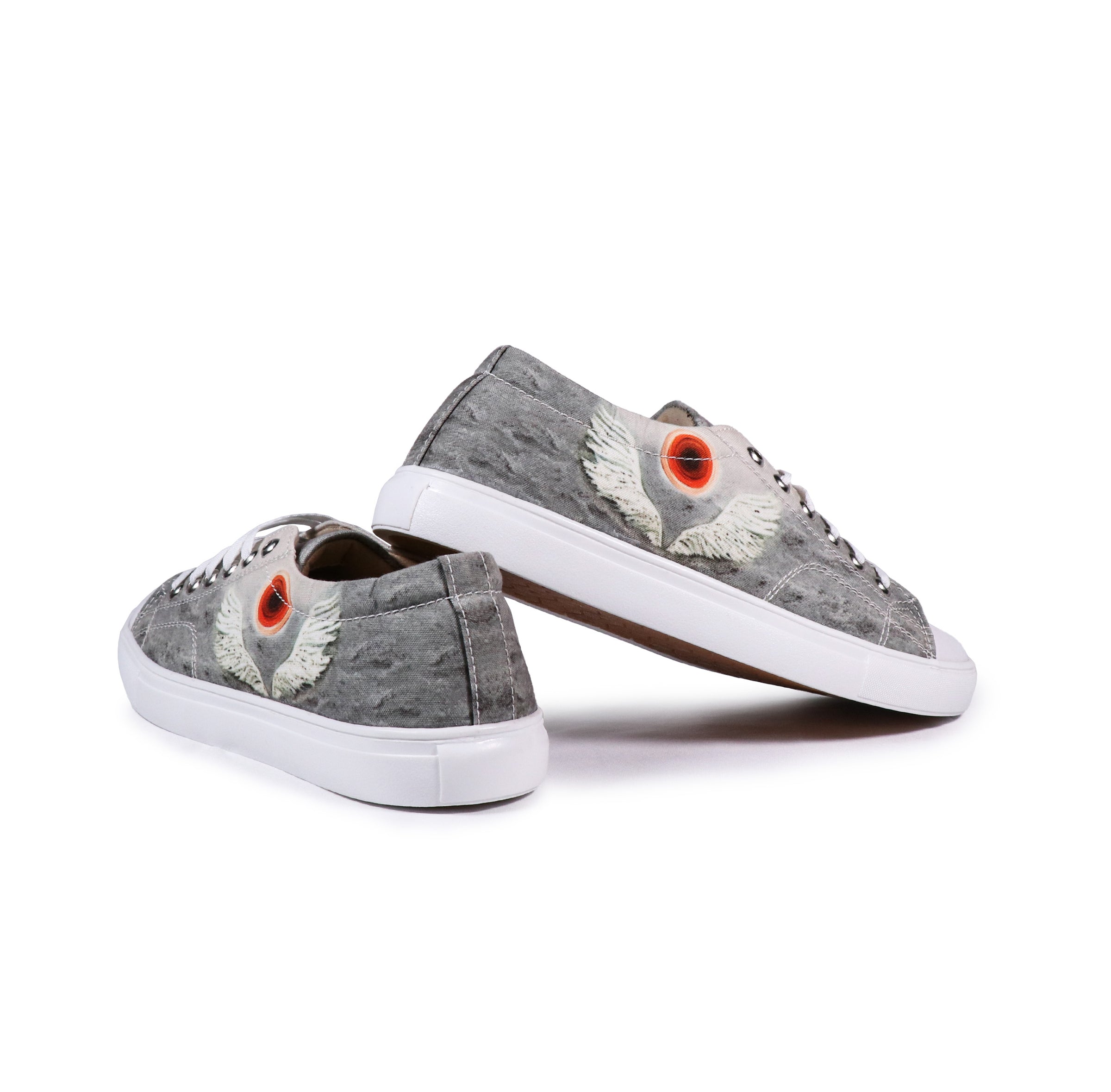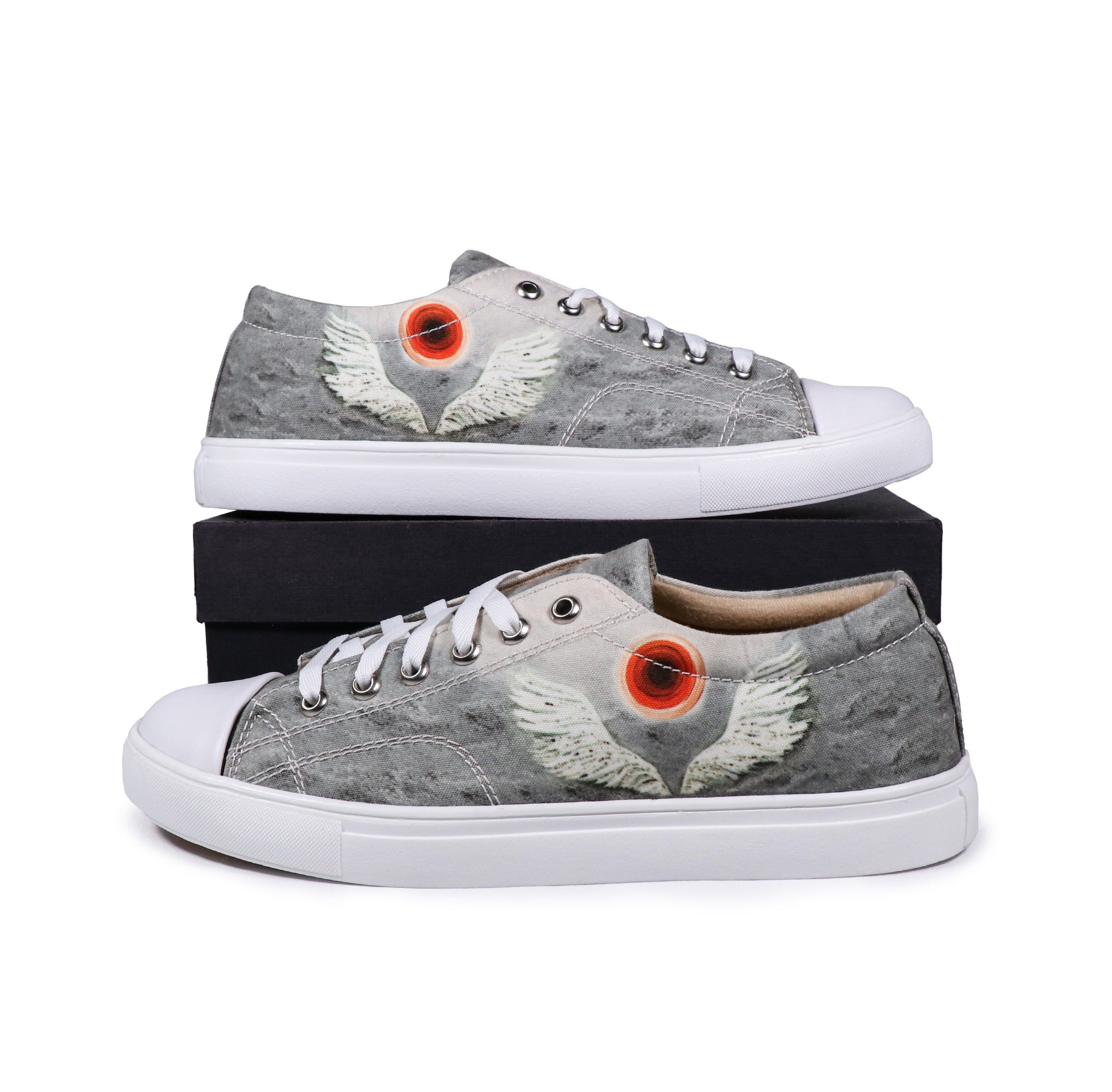 | Artist – Arshdeep Singh Art This high-ankle shoes embodies the spirit of freedom with a striking winged painting and a central circle against a moody grey sky. |