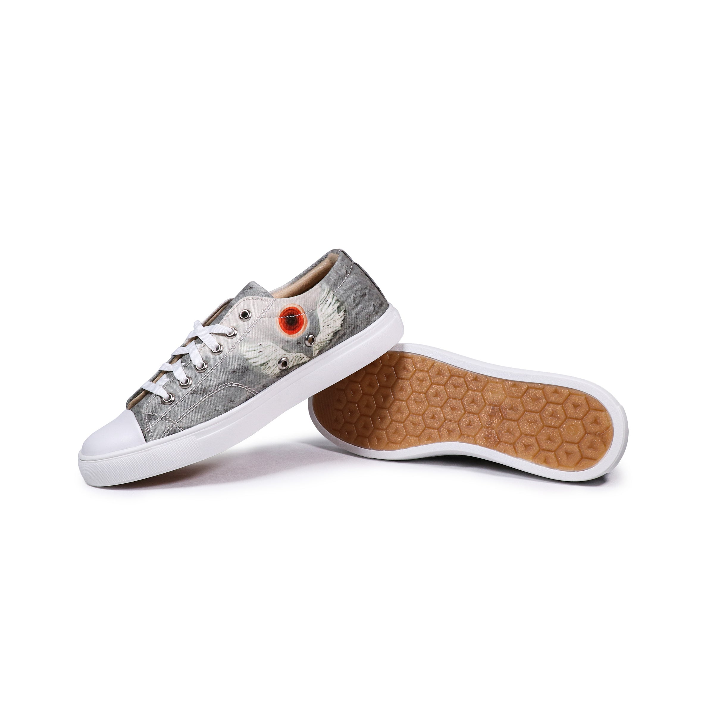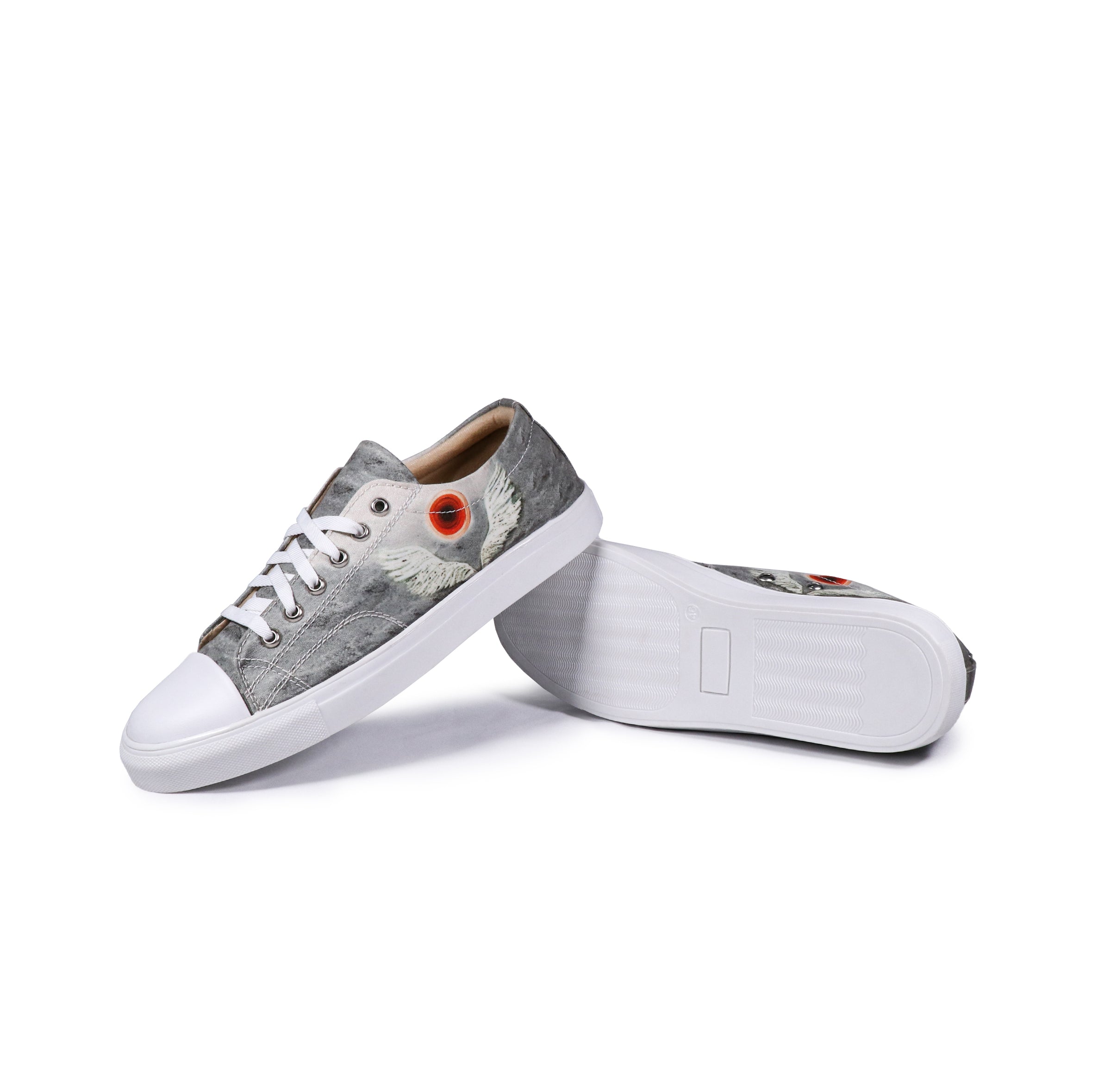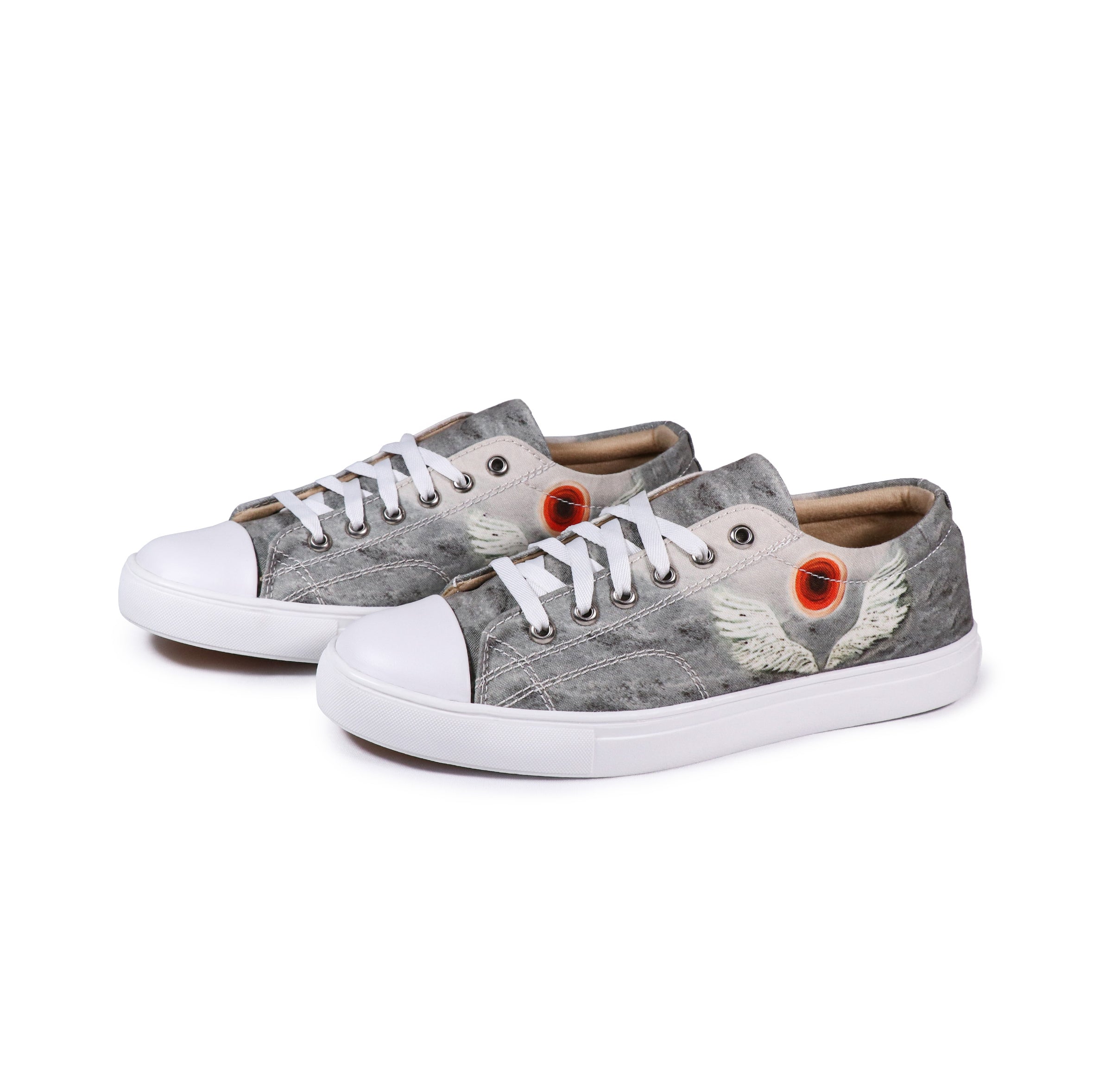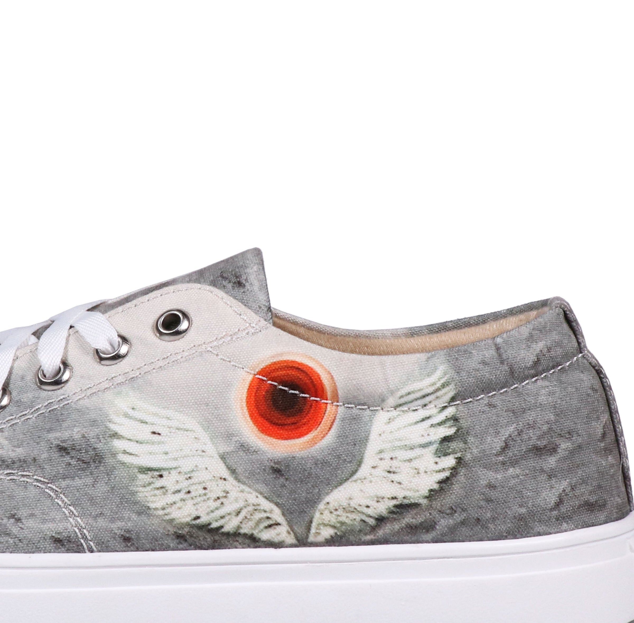 | Artist – Arshdeep Singh Art This high-ankle shoes embodies the spirit of freedom with a striking winged painting and a central circle against a moody grey sky. |